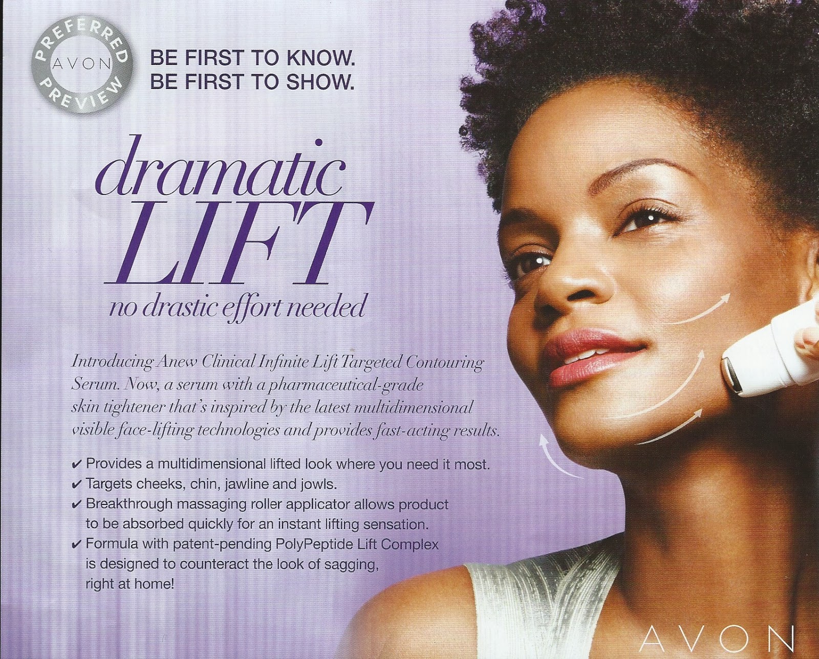 In years past, we have seen Anew come through with all their promises - my skin was healed by the early Alpha Hydroxy Acid formulas after a major burn. We have seen the effects of PRO LINE ERASER change lives within 4 days to 2 weeks showing 100% results in 100 women. We have seen the effects of ABSOLUTE EVEN, as it diminishes freckles, liver spots, age spots, acne scars, you name it, it fixes it. Now Infinite Lift will help with these areas: