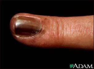 Melanomas beneath the fingernail appear as a black or bluish black discoloration. This is called "acral lentiginous melanoma" and is the least common form of melanoma. It usually occurs on the palms, soles, or under the nails and is more common in African-Americans.