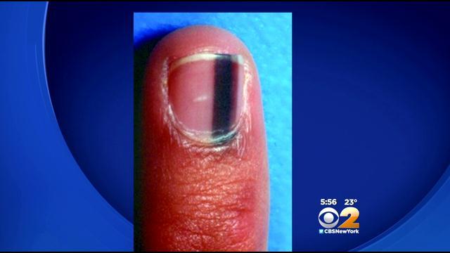 Melanomas beneath the fingernail appear as a black or bluish black discoloration. This is called "acral lentiginous melanoma" and is the least common form of melanoma. It usually occurs on the palms, soles, or under the nails and is more common in African-Americans.